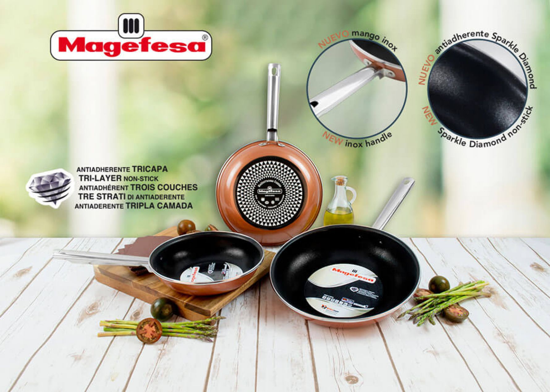 - Recubrimiento antiadherente tricapa reforzado Sparkle Diamond libre de PFOA by Whitford©.