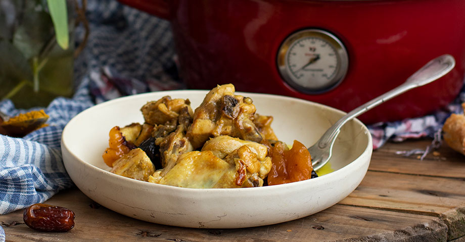 Put olive oil in the pot. Heat on medium heat. Add onion and sauté for 5 minutes (the temperature in the pot will reach 100 degrees Celsius). Sprinkle chicken pieces with salt and pepper. Add chicken to the pot. Cover with a lid and fry lightly for 20 minutes over higher heat (up to 120 degrees Celsius), stirring from time to time so that the chicken cooks evenly. Add wine, spice mix, dates, prunes and apricots. Cover and cook on medium-high heat (140 degrees Celsius) for 20 minutes. Remove from pot and serve.