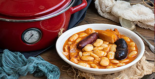 Verser dans le récipient les haricots blancs, le chorizo, le lard, les poivrons propres et découpés en morceaux, la feuille de laurier et la ñora. Verser le litre et demi d’eau. Laisser cuire à feu moyen jusqu’à atteindre 100 degrés. À ce stade, il faut interrompre l’ébullition des haricots blancs en ajoutant 200 ml d’eau. Lorsque le liquide commence de nouveau à bouillir, à 100 degrés, verser à nouveau 200 ml d’eau, et recommencer l’opération une troisième fois. Au total, cela nous prendra environ 1 heure. Ensuite, laisser le récipient atteindre 100 degrés, pas plus.